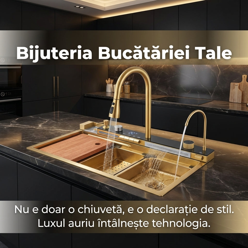 Transformă-ți bucătăria într-un spațiu de lux demn de o revistă de design. Aceasta nu este doar o chiuvetă, ci o veritabilă stație de lucru tehnologizată, care îmbină estetica spectaculoasă a finisajului auriu cu funcționalitatea supremă. Fabricată din oțel inoxidabil premium, rezistent la coroziune și zgârieturi, devine piesa centrală a bucătăriei tale, oferindu-ți o experiență de gătit și curățare complet automatizată și rafinată.
