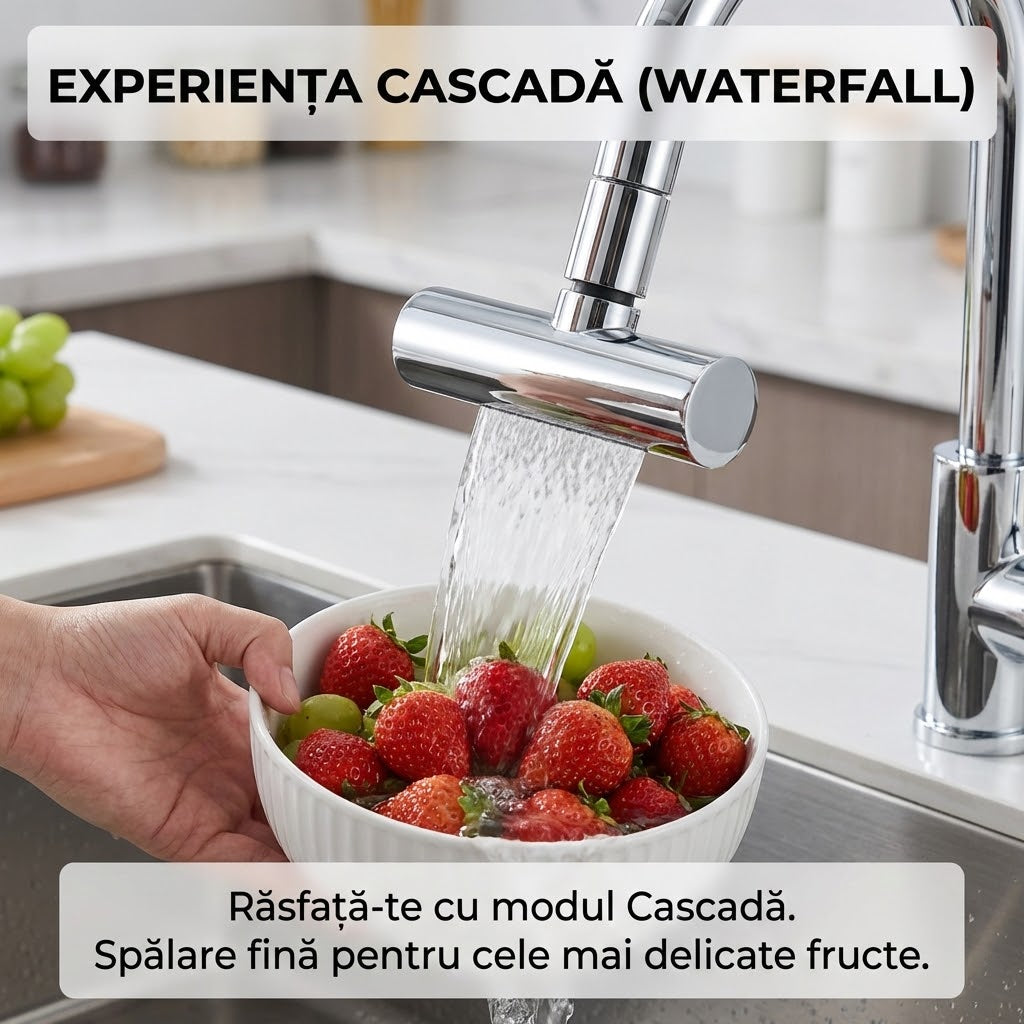 - Funcție Cascadă: Jet lat și plat, ideal pentru spălarea rapidă a fructelor și legumelor.