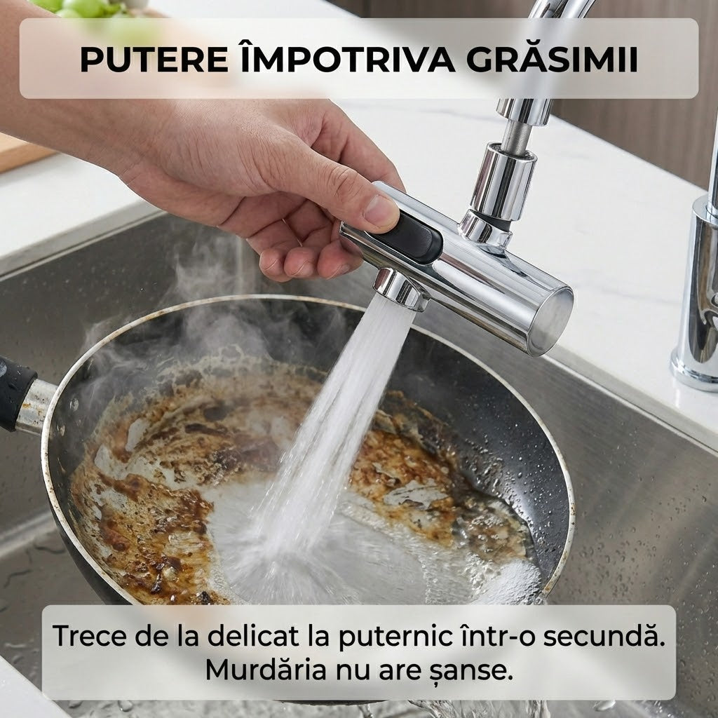 Designul cu rotire 360° elimină unghiurile moarte. Poți direcționa jetul de apă exact acolo unde ai nevoie, facilitând spălarea vaselor voluminoase sau curățarea completă a chiuvetei după utilizare. În plus, tehnologia anti-stropire menține blatul și hainele uscate, chiar și la presiune mare.