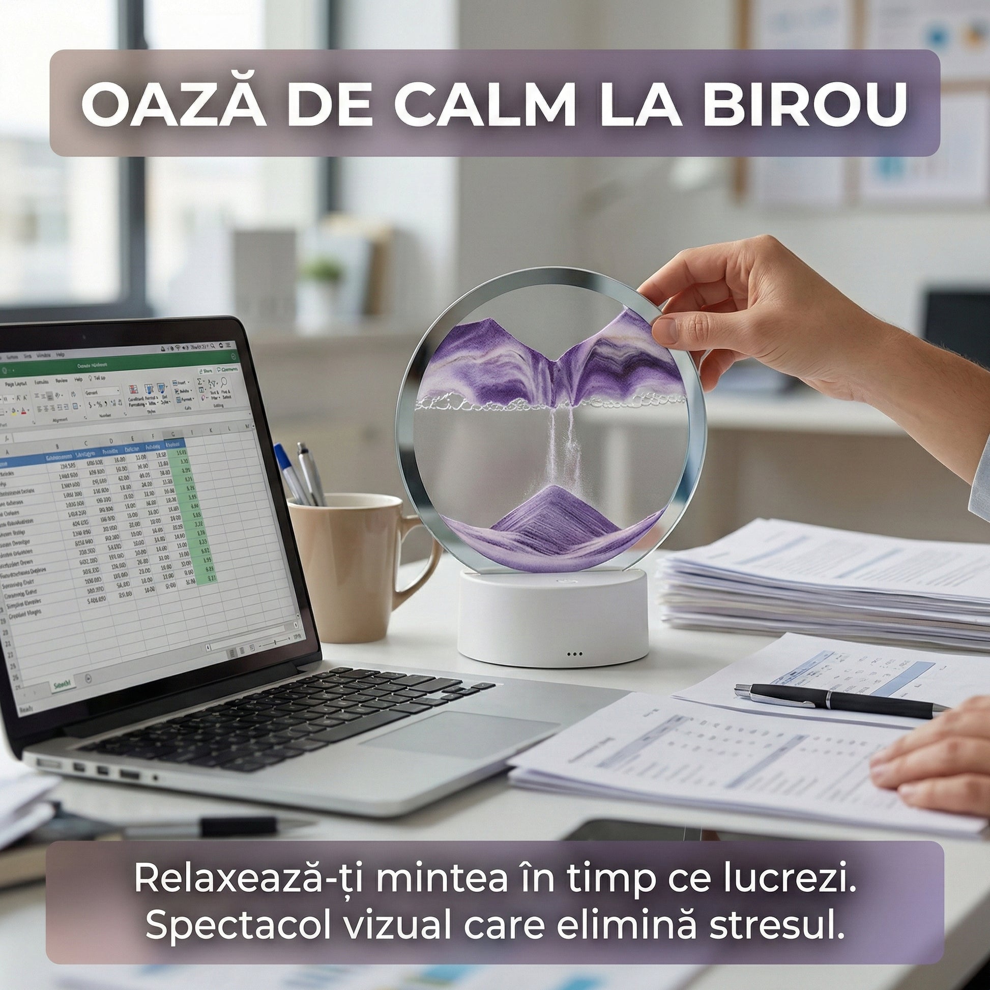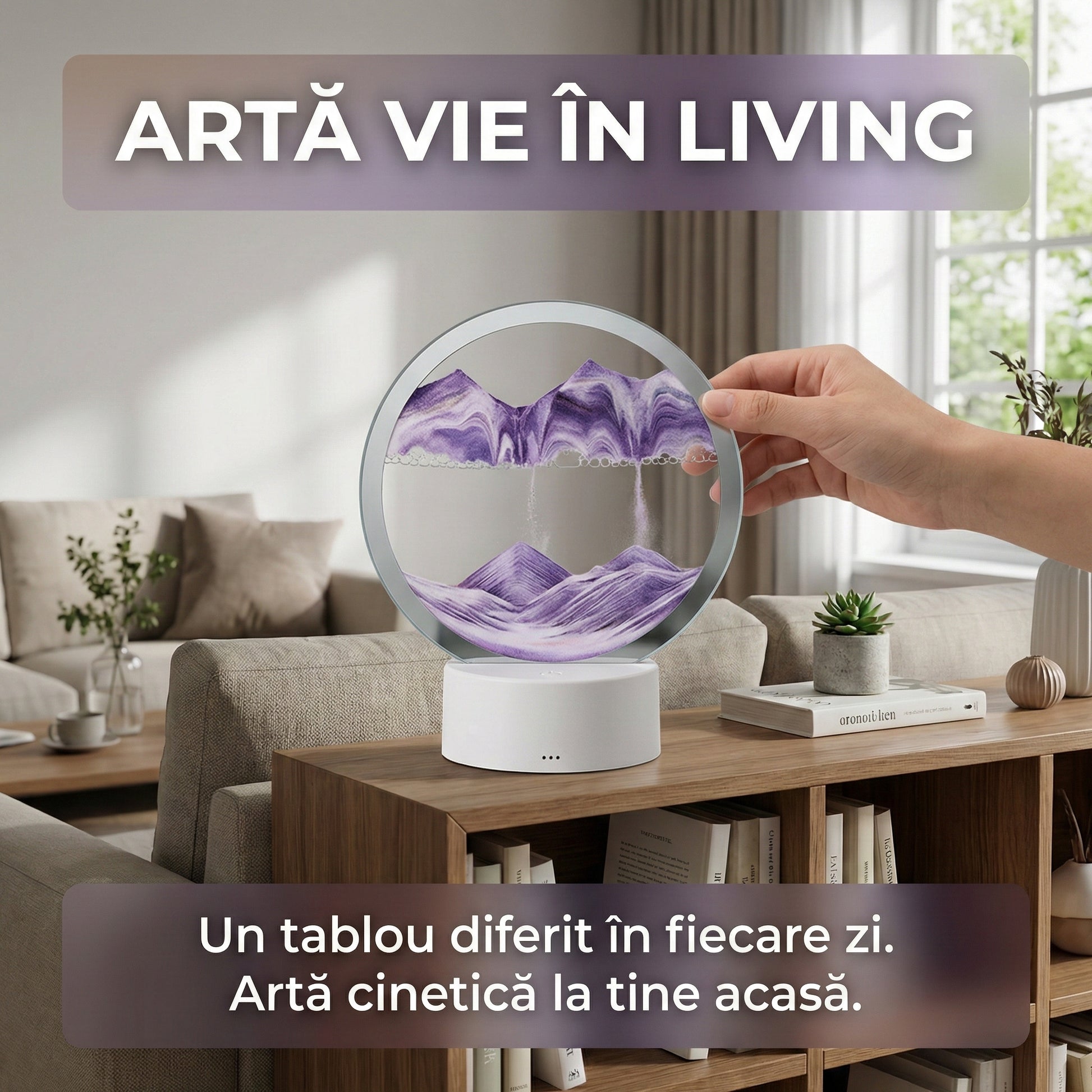 Transformă-ți camera într-un sanctuar de relaxare vizuală. Cauti un obiect de decor care să fie mai mult decât o simplă lampă? Această "clepsidră" modernă combină arta dinamică a nisipului mișcător cu tehnologia LED RGB pentru a crea un spectacol 3D fascinant. Fiecare întoarcere a discului creează un peisaj unic de dune și munți de nisip mov, în timp ce lumina ambientală își schimbă culorile, oferindu-ți o experiență senzorială liniștitoare, perfectă pentru birou sau noptieră.