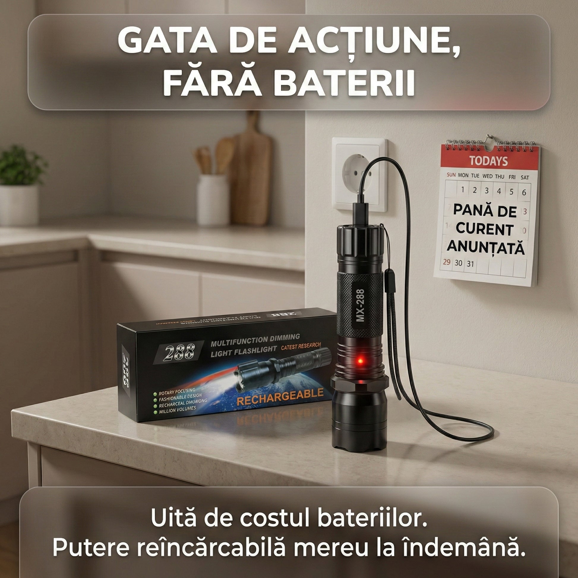 - Reîncărcabilă: Include acumulator intern și încărcător de perete (220V), eliminând costul bateriilor de unică folosință.