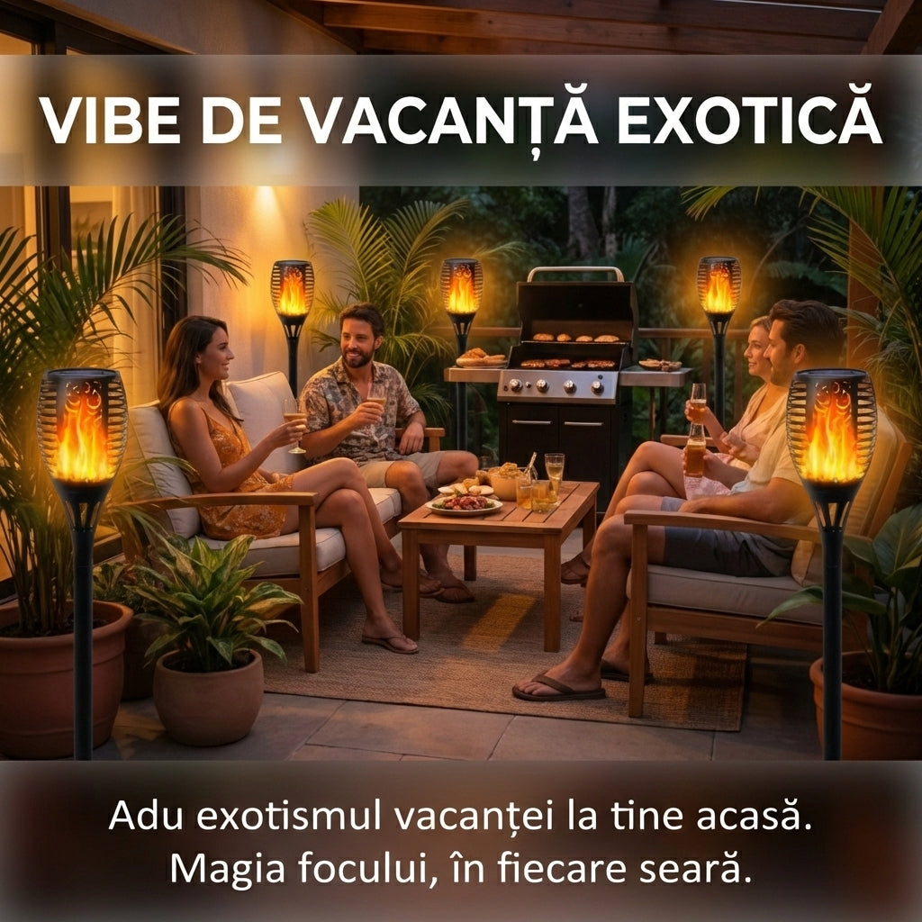 Transformă-ți grădina într-un paradis exotic și romantic. Vrei să adaugi o notă de magie serilor petrecute în aer liber, dar fără pericolul focului deschis? Acest set generos de 10 lămpi solare recreează perfect atmosfera torțelor tradiționale "Tiki". Cu un efect vizual spectaculos de "flacără dansantă", aceste lămpi emit o lumină caldă și tremurătoare, fiind decorul ideal pentru alei, petreceri la grătar, nunți sau pur și simplu pentru relaxare.