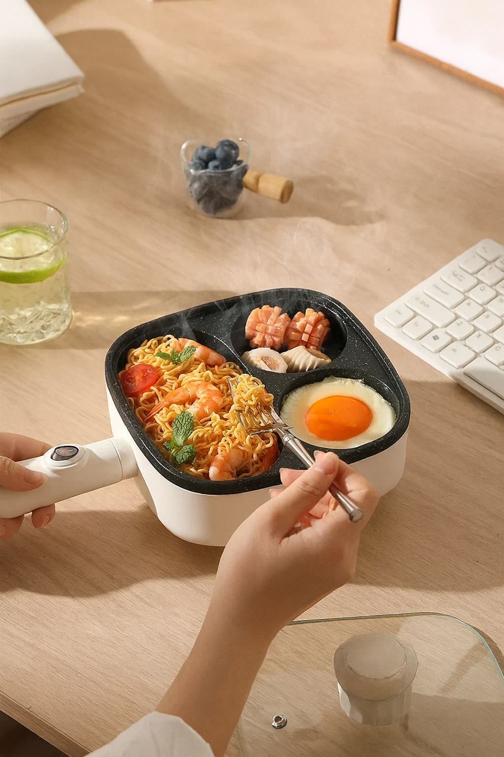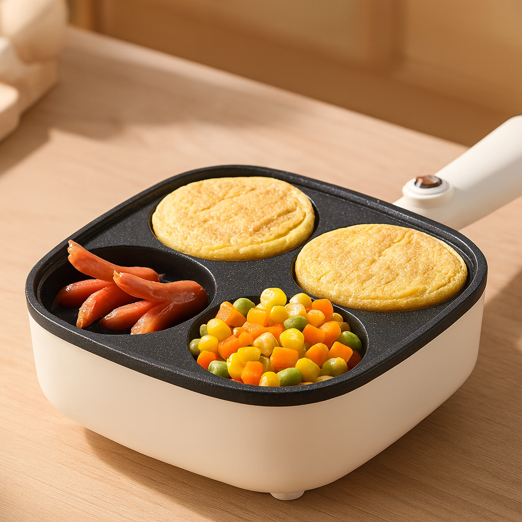 Cu această tigaie electrică, poți prepara până la 4 ouă ochiuri în același timp, economisind timp dimineața. Fiecare compartiment are dimensiuni egale, asigurând o coacere uniformă și estetică. Ideală pentru familii sau pentru cei care iubesc organizarea în farfurie.
